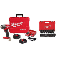 M18 FUEL? 1/2" Mid-Torque Impact Wrench w/ Friction Ring (2962-22), (2) M18 REDLITHIUM? XC5.0 Resistant Battery Pack (48-11-1850R), M18 and M12 Multi-Voltage Charger (48-59-1812), Blow Molded Case; 19Pc. SHCOCKWAVE Impact Duty? 1/2" Drive SAE Deep 6 Point Socket Set