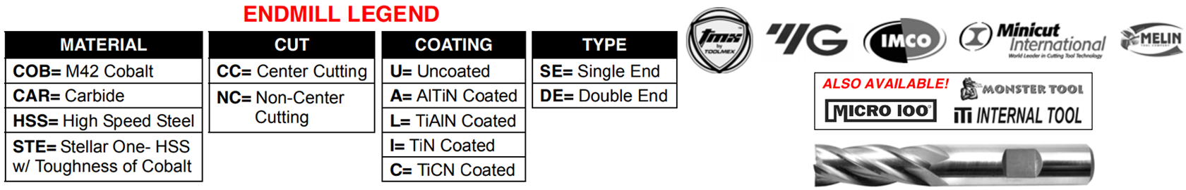 3 Flute Square End Endmills (Cobalt & Carbide)- For Finishing Non-Ferrous Materials & Hard Alloys