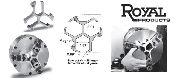 This product is so useful and simple, you'll wonder why you never thought of it. The Royal chuck stop is a precision machined aluminum extrusion which mounts squarely against the face of almost any 3 jaw lathe chuck, providing a fixed reference surface for workpieces to locate against.