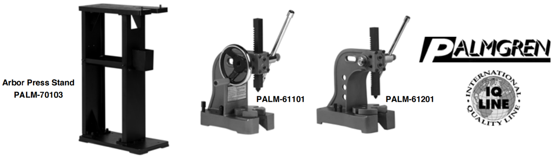 The Palmgren arbor press delivers the heavy force needed for riveting, squeezing, punching, bending, and other pressing applications. Sturdy, cast-iron construction. Removable machined steel anvil provides accurate work support in four slot positions. Rugged steel ram is driven by a machined pinion. Punches or tools may