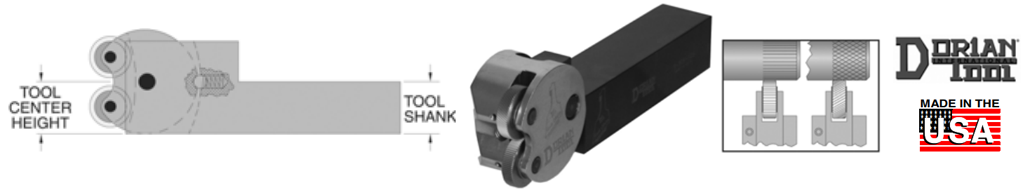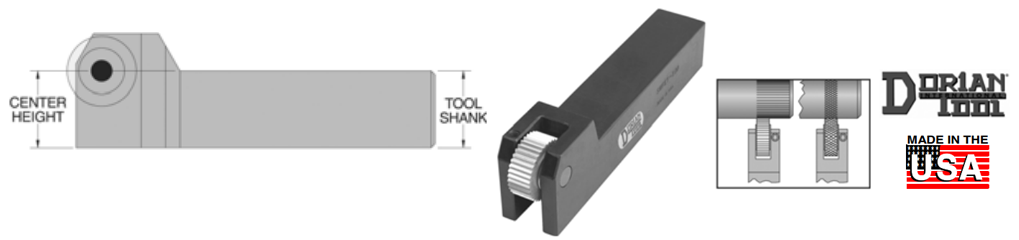 The dovetail mounting of the shank and head insures that the tool will be rigid and adjustable yet easy to use. By turning the adjustment screw clockwise or counterclockwise the center height of the head can be adjusted. Each eighth turn of the screw, which is marked on the screw, moves the head .004". After the desired center height has been reached, tightening the lock screw ensures that the head will remain in position while knurling a part.