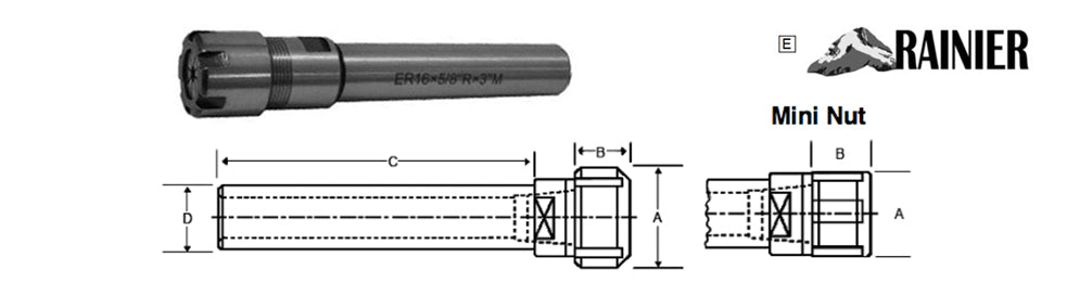 | Collet Series | Shank Dia D | Shank Length C | Nut Dia A | Nut Length B | Nut Type | Shank Type | Part Number | Thread of Nut | Collet Nut Part Number | Wrench Part Number |