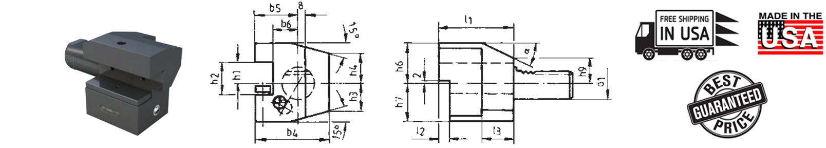 | d1 | b1 | b2 | b3 | h1 in | h1 mm | h2 | h3 | h4 | h6 | h7 | h9 | L1 | L2 | L3 | α | Part Number |
