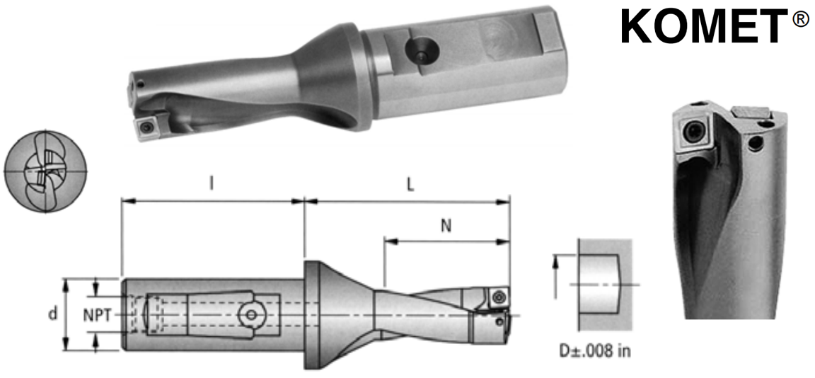 | Drill Dia D | Shank Dia d | Drill Depth 2 X D | Shank Length l | Flute Length N | Shoulder To Tip L | NPT | KOMET Reference | Part Number |