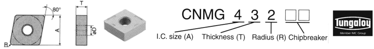 | CNGG432 | CNGG120408 | 1/2 | 3/16 | 0.031 1/32 | Uncoated Carbide | Cont | LP | TH10 | TO-1208 |
