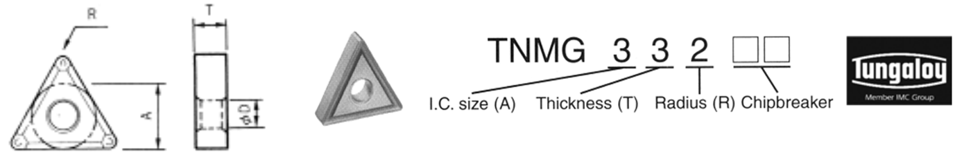 | TNMG332 | TNMG160408 | 3/8 | 3/16 | 0.031 1/32 | Cont & Int Turning | Medium Turning | TM | T9125 | TO-3645 |