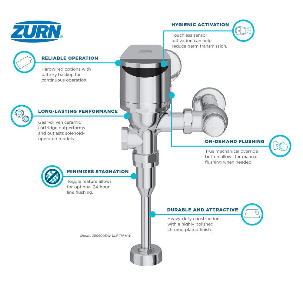 Automatic Flush Valves; Valve Type: Urinal; Flush Style: Single Flush; Gallons Per Flush: 0.5; Flush Valve Location: Exposed; Pipe Size: 0.75 in; Spud Coupling Size: 1.5 in; Cover Material: Chrome; Power Source: Hard Wire, 4AA Battery Backup