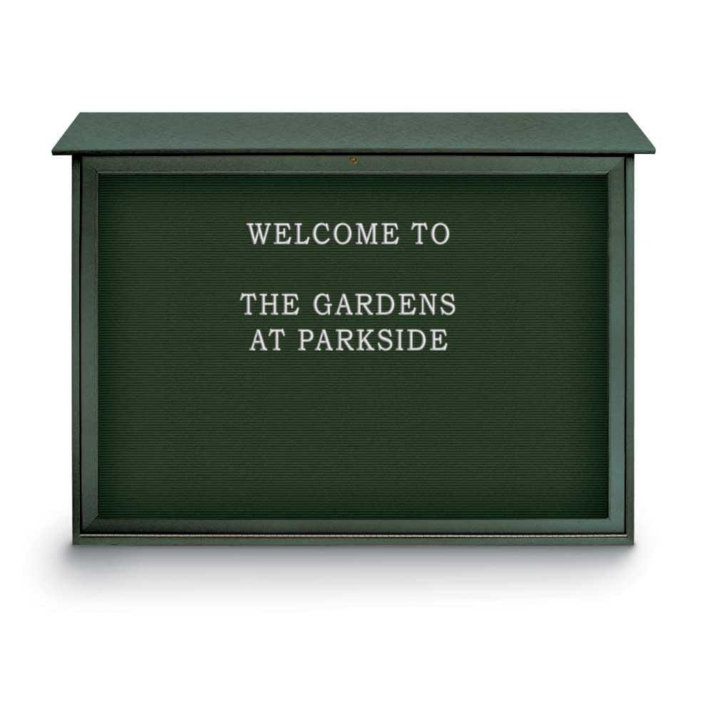 Detailed Product Description | 52" x 40" Single Door Bottom Hinged Message Center with Green Felt Letterboard & Woodland Green Recycled Plastic Frame |