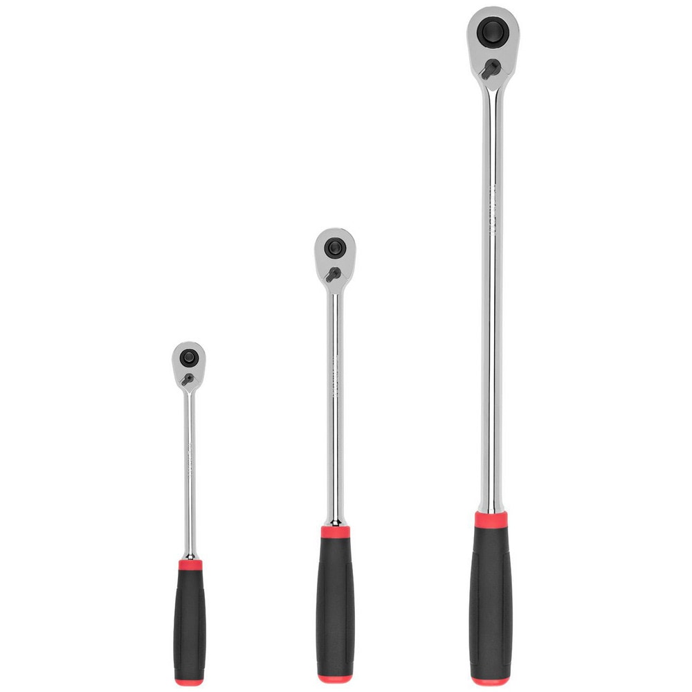 Includes | 1/4, 3/8, 1/2" Drive Quick-Release Comfort Grip Long Ratchet Set 3Pc 9", 12", 18" |