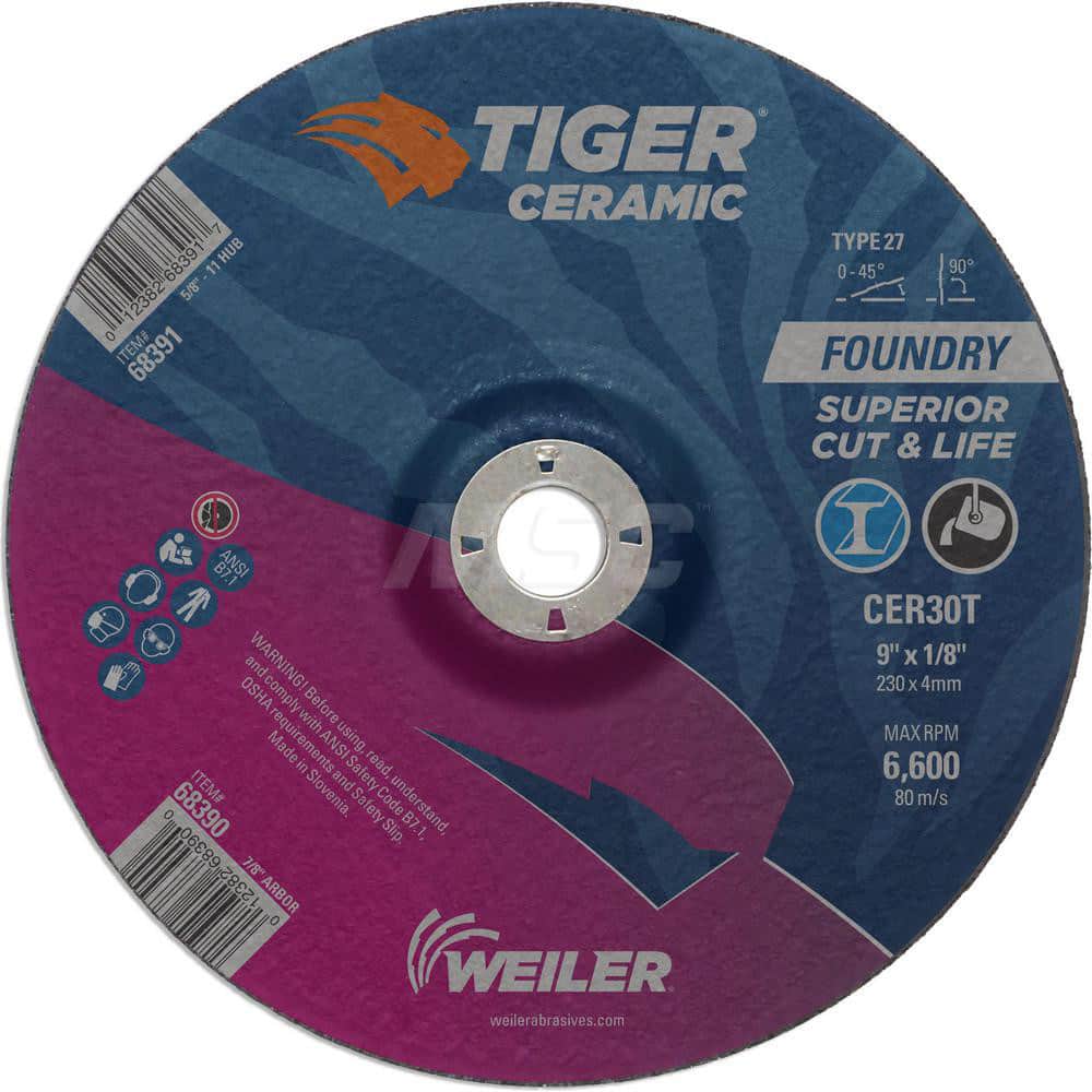 Depressed Center Wheel: Type 27, 9″ Dia, 1/8″ Thick, 7/8″ Hole, Ceramic Alumina 30 Grit, Resinoid, 6,650 Max RPM, Use with High Frequency Grinder, Right Angle Grinder & Air Grinder