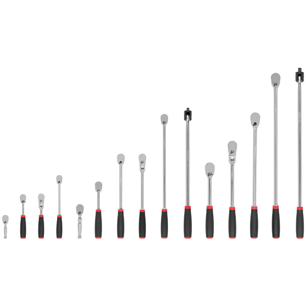 Includes | Stubby Racthets: 1/4"Drive 3", 3/8"Drive 4-1/2"; Breaker Bars: 3/8"Drive 18", 1/2" Drive 24"; Flex Head Racthets: 1/4"Drive 6", 3/8"Drive 12", 1/2"Drive 14"; Fixed Head Ratchets: 1/4" Drive: 6" & 9", 3/8"Drive: 8", 12" 18",1/2"Drive:10-1/2", 18" 24" |