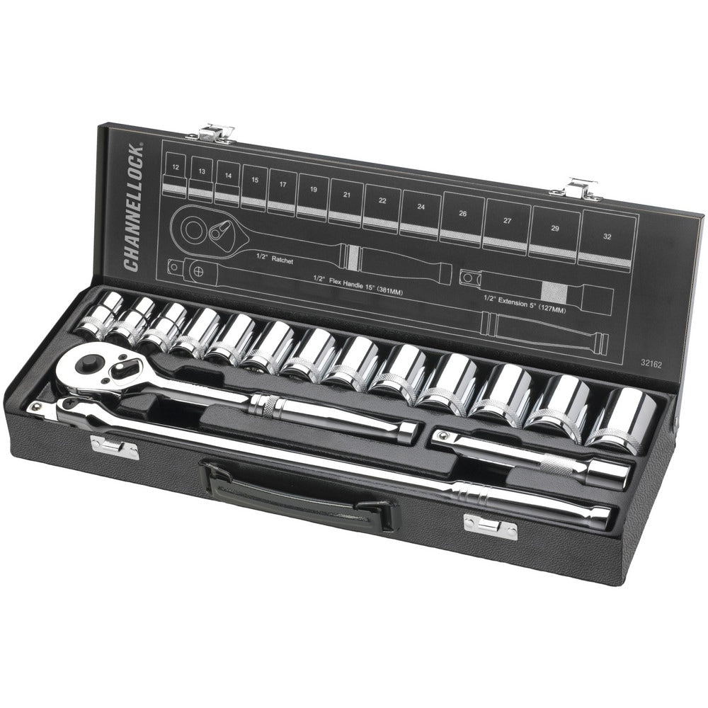 Additional Information | 1/2 INCH QUICK RELEASE 45 gear teeth ratchet; DYNA DRIVE Torque System offers 20% more torque, eliminates slippage, and prevents damage to fasteners; METRIC 1/2 inch drive chrome vanadium sockets; DURABLE steel case with molded inlay for secure storage; CONTENTS: 6 pt. Standard Sockets: 12, 13, 14, 15, 17, 19, 21, 22, 24, 26, 27, 29, 32mm, 5 inch (127mm) Extension, 15 inch (381mm) Flex Handle, Quick Release 45 Gear Teeth Ratchet |