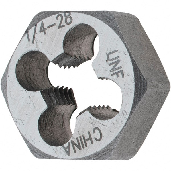 Hex Rethreading Dies; Thread Size: 1/4-28 ; Hex Size (Inch): 19/32 ; Material: Carbon Steel ; Thread Direction: Right Hand ; Thread Standard: UNF ; Thickness (Inch): 1/4