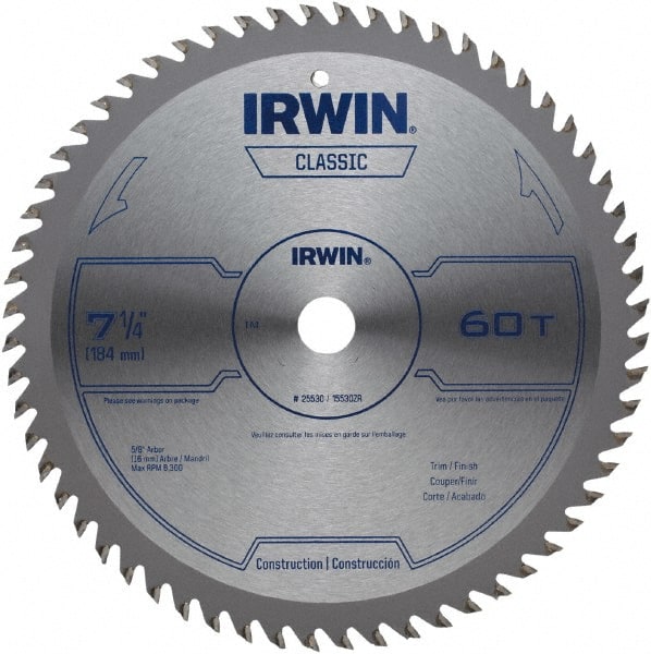 Irwin Blades - 7-1/4" Diam, 5/8" Arbor Hole Diam, 60 Tooth Wet & Dry Cut Saw Blade - Carbide-Tipped, Smooth Action, Diamond Arbor