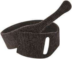 Self-fastening tie/strap hook and loop fasteners have a single strip with hooks on one side and loops on the other that grip each other to form a strong hold. They are used for bundling and holding cable or tools.