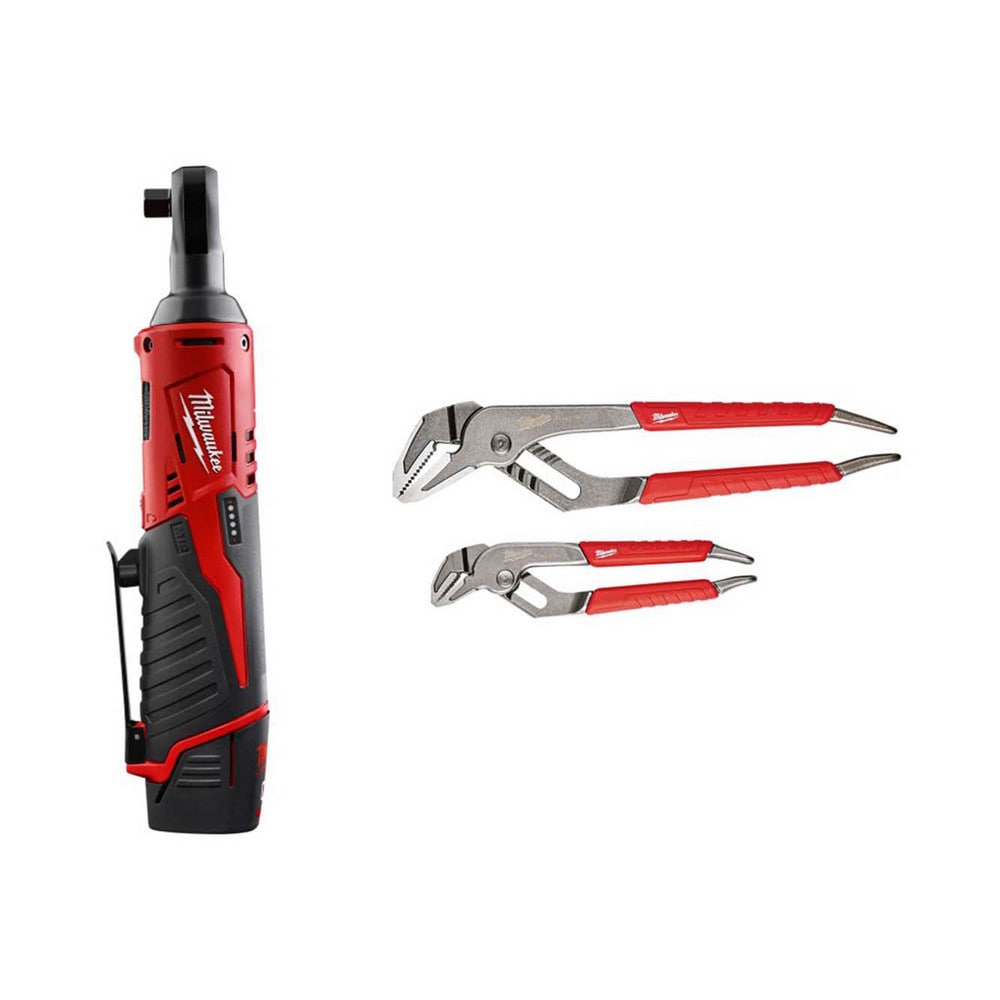 Includes | 3 Pc. M12™ Cordless 3/8" Lithium-ion Ratchet Kit; 2 Pc. 6" & 10" Comfort Grip Straight Jaw Pliers Set |