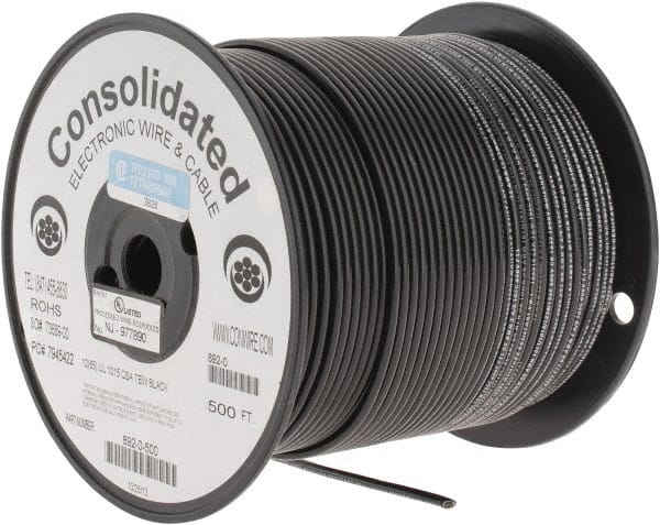 Made in USA - 12 AWG, 65 Strand, 500' OAL, Tinned Copper Hook Up Wire - Black PVC Jacket, 0.155" Diam