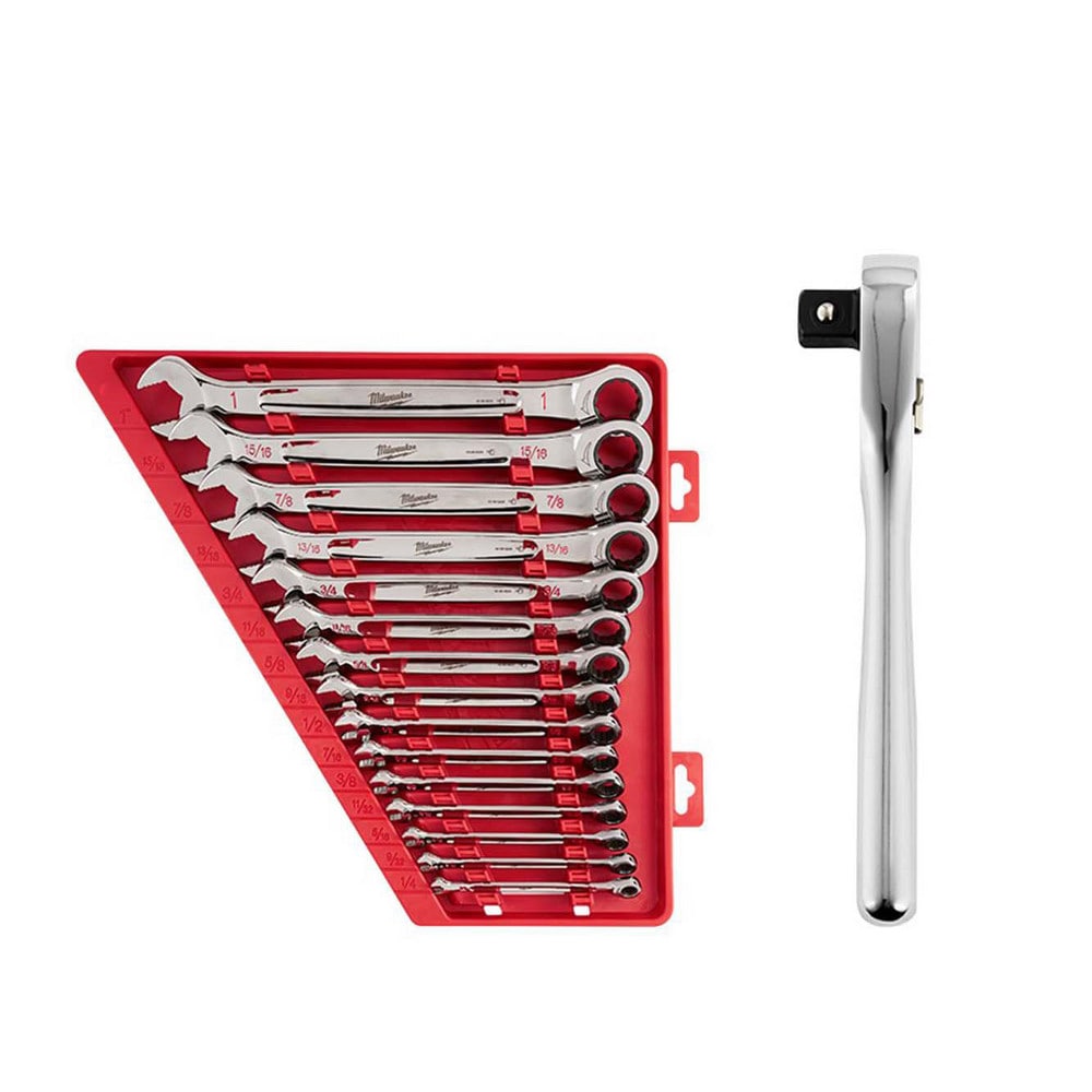 Includes | 5/8 in Ratcheting Combination Wrench; 11/16 in Ratcheting Combination Wrench; 3/4 in Ratcheting Combination Wrench; 9/32 in Ratcheting Combination Wrench; 3/8" Drive 5" Ratchet; 15/16 in Ratcheting Combination Wrench; 3/8 in Ratcheting Combination Wrench; 7/16 in Ratcheting Combination Wrench; 5/16 in Ratcheting Combination Wrench; 7/8 in Ratcheting Combination Wrench; 1 in Ratcheting Combination Wrench Ratcheting Combination Wrench; 13/16 in Ratcheting Combination Wrench; 9/16 in Ratcheting Combination Wrench; 11/32 in Ratcheting Combination Wrench; 1/2 in Ratcheting Combination Wrench; 1/4 in Ratcheting Combination Wrench |