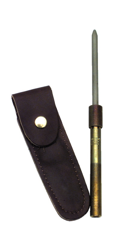 *Diamond Sharpeners *Diamond Sharpening Stones *1/4 Dia. Shaft 3-3/4 Shaft Length 8-1/2 OAL, Brass Handle in Pouch *Exclusive patented Eze-Lap manufacturing process embeds an engineered blend of poly-crystalline industrial diamonds in a stainless steel matrix on steel bases *Products are heat treated, producing ideal hardness in the matrix for surface durability and diamond retention yielding an abrasive surface that is harder than any metal or knife blade
