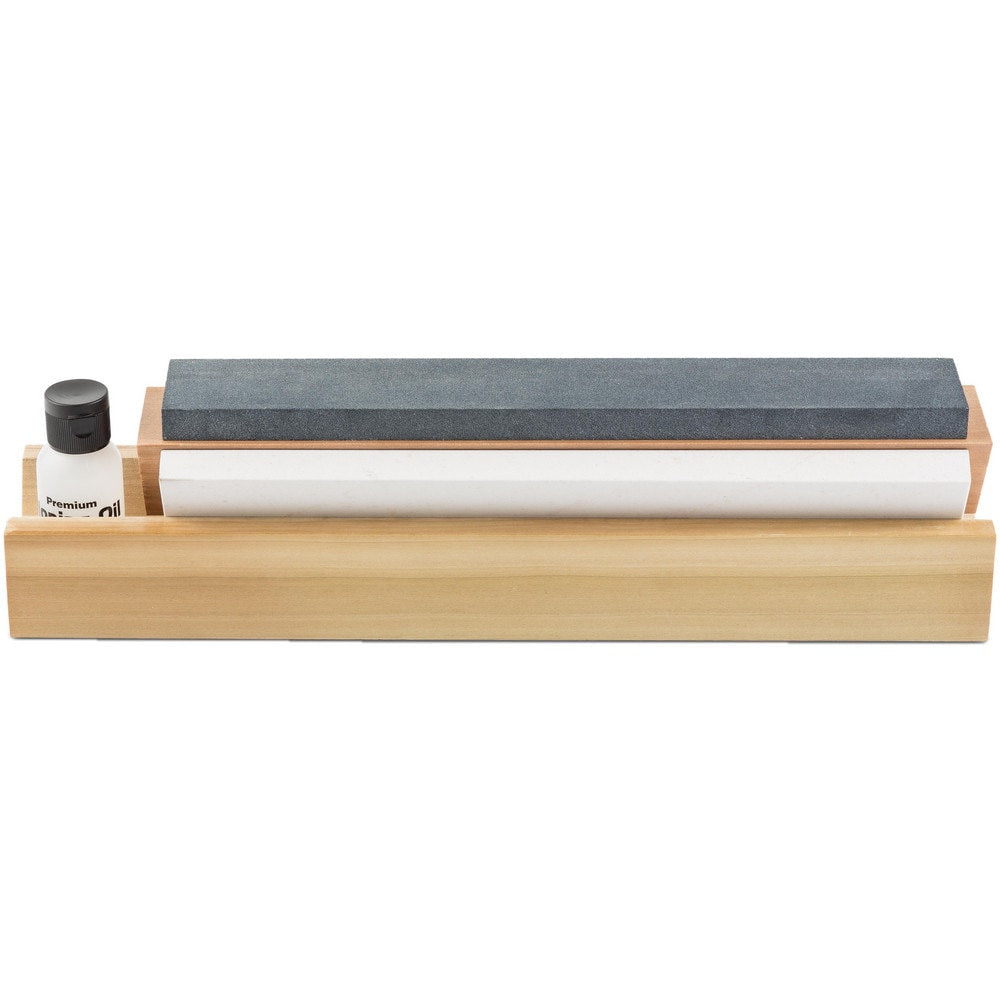 Includes | 1 oz. Bottle of Honing Oil; Wooden Base; Aluminum Oxide/Soft Arkansas/Hard Arkansas Stone Piece |