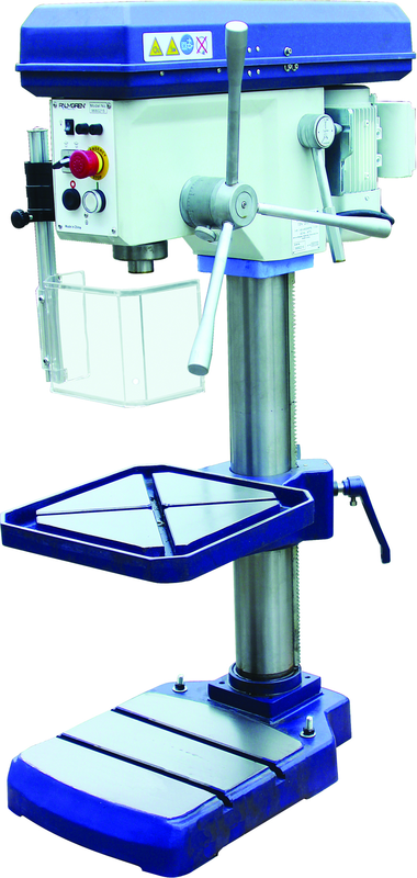 •Palmgren premier line of step pulley drill presses have a wide range of speeds and are constructed through-out to form a solid base for heavy, accurate continuous use •The pulleys are long wearing aluminum alloy, fully machined and balanced •Combined with a Gates 7M industrial V-ribbed V-belt that delivers better gripping and power with a service life of 10,000 hours •Speed changes are fast and easy – our exclusive quick change handle and motor spring plate provides consistent, proper tension from the motor to the belt and pulleys all the time •The fully enclosed machine tool spindle has a concentricity of 0.0005" at the spindle nose •These drills can be used to perform all hole making operations – drilling, tapping, reaming, boring, spot-facing, counterboring and chamfering in any type of material •Forward & reverse switch •Drill depth stop •T-slotted table and base •Interlocking spindle safety guard •Electric interlock onthe pulley cover •Magnetic overload protection •Chuck and arbor •Built in tool ejector •3 Year Warranty