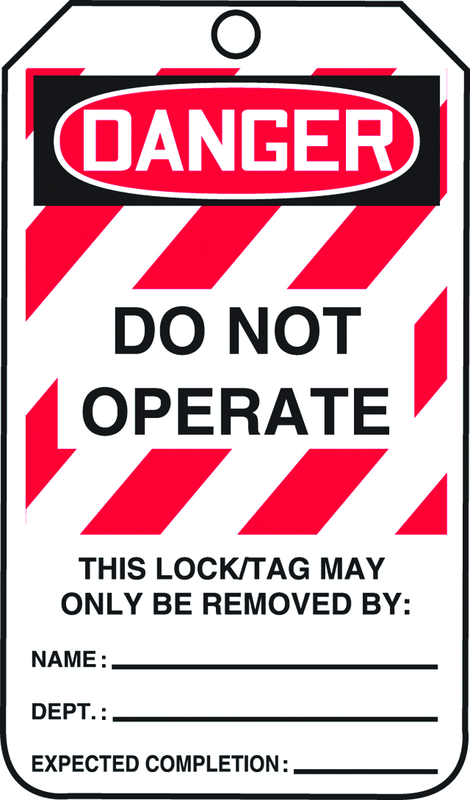 •Brand Name: Accuform •Color: Red/Black On White •Header: Danger •Height: 5-3/4 •Material: Plastic •Message - Back: This Energy Source Has Been Locked Out! Unauthorized Removal Of This Lock/Tag May Result In Immediate Discharge •Message - Front: Do Not Operate •Shape: Rectangle •Width: 3-1/4