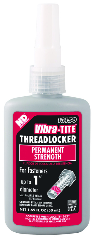 •A permanent locking threadlocker for fasteners up to 1" in diameter •High lubrication value for easy assembly •Excellent for preventing rust and corrosion in extreme chemical/environmental conditions •Works in temperature ranges from -65° to 300°F •Equivalent to LOCTITE 262.