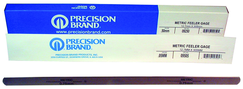 *Brand Name: Precision Brand *Description: Metric Steel Feeler Gage Pack (Pack of 12) *Length: 305mm *Material: C1095 Spring Steel *Size: 12.7mm x 305mm *Thickness: .65mm *Type: Steel Feeler Gage Pack *Width: 12.7mm