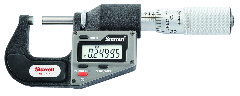 •Accuracy: .0001 / .002mm •Brand Name: Starrett •Face: Carbide •Measuring Range: 0 - 1 / 0 - 25.4mm •Model Number: 3732XFL-1 •Resolution: .00005 / 0.001mm •Thimble Type: Friction •Type: Electronic Outside Micrometer