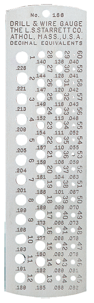 •Brand Name: Starrett •Model Number: 186 •Number of Holes: 1-1/2 x 5-1/2 •Size: #1 to 60 •Type: Drill Gage