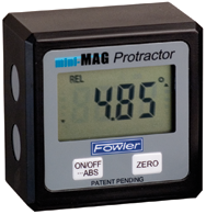 •The mini-MAG Protractor provides instant 360° digital inclination display of any angle with the additional unique feature of embedded magnets on two sides. •Embedded magnets with 3.5 lb. pull •Measuring range: 360° (4 x 90°) •Resolution: .05° •Accuracy: ± .1° •Repeatability: ± .1° •Voltage: standard 9V battery (250 hrs.)