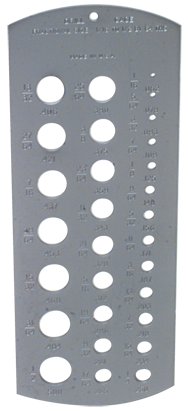 •Drill Gages Industrial Hardened •1/16to 1/2Fractional Size Drill Gage •Gage has 29 measuring holes for determining twist drill sizes from 1/16" to 1/2" in 1/64" increments •Shows drill sizes in inches and decimal equivalents
