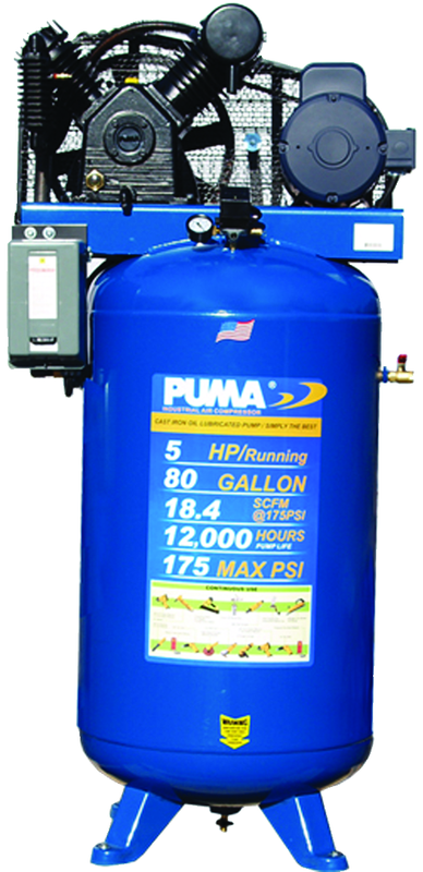 •AFCM: 19.2 @ 100 PSI •Brand Name: Puma •Max PSI: 175 •Model No.: TK5080VM •Motor: 5HP, 230V, 1PH •Starter Included: Yes •Tank: 80 Gallon / Vertical •Weight: 530 lbs