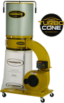 •The PM1300TX Dust Collector features the exclusive TurboCone™ which improves chip separation to prevent clogging of the filter, and increases packing efficiency of the collector bag •The canister filter offers superior filtering surface area over standard bags, and captures 98% of 2-micron particles •A digital timer can be set for up to 99 minutes, and an infrared sensor allows remote control operation •The all-metal duct improves rigidity and air flow •The clear collector bags are large capacity, which means less down-time changing them •Four swivel casters and conveniently located handles allow for easy mobility •5 Year Warranty