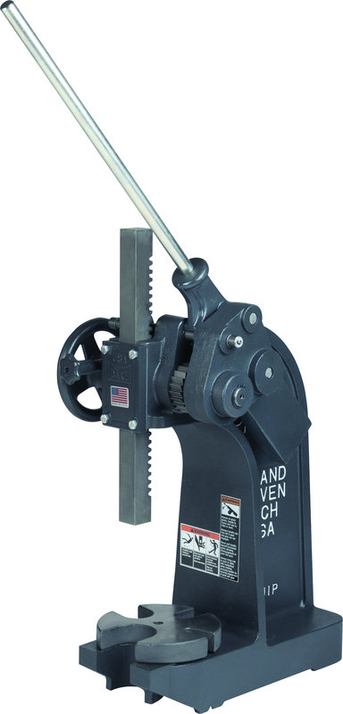 •Base: 20 x 8-1/2 •Brand Name: Dake •Capacity (tons): 6 •Capacity Over Table: 15 •Height: 26 •Leverage Ratio: 66:1 •Maximum Work Arbor: 3 •Maximum Work Diameter: 15-1/2 •Model Number: 2 •Ram Dimension Square: 1-1/2 x 1-1/2 •Stand: #3002 •Throat: 7-3/4 •Type: Compound Leverage Arbor Press •Weight: 280 lbs