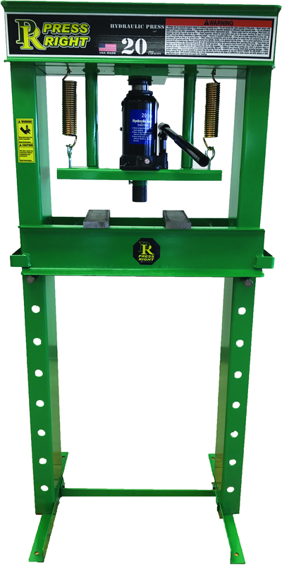 •Base: 24 •Brand Name: Press Right •Capacity (tons): 20 •Height: 66-1/2 •Inside Width: 20-1/2 •Model Number: 1720 •Motor: N/A •Ram Travel (in): 5-1/8 •Type: Hydraulic Shop Press - Hand Operated •Weight: 256 lbs