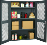 •Heavy duty all welded 14 guage steel •3-point locking system with chrome keyed handle and 5/16" diameter lock rods •Full height welded piano hinges for increased strength and rigidity of doors •Punched diamond pattern in doors allows content visibility and ventilation •Adjustable shelves rest on louver uprights and adjust on 4" centers.(no tools required) •F.O.B. Texas