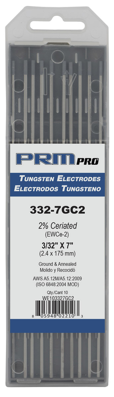 •Brand Name: PRM Pro •Color: Gray •Depth: 0.9380" •Diameter: 3/32" •Length: 7" •Material: Tungsten •Model: 332-7GC2 •Style: 2% Ceriated •Type: Electrode •Width: 0.9380"